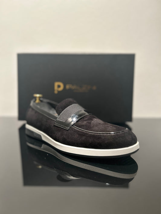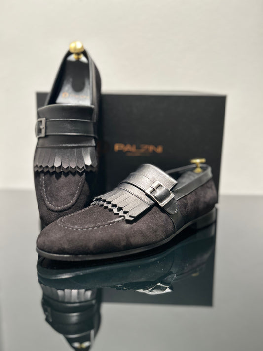 HANDMADE BLACK SUEDE SLIP-ON WITH STRAP & LEATHER DETAILING