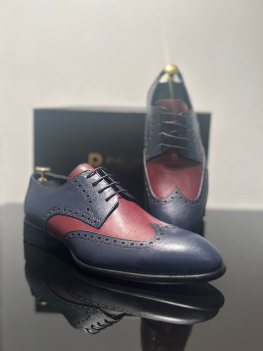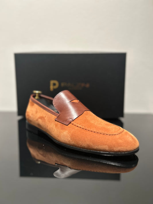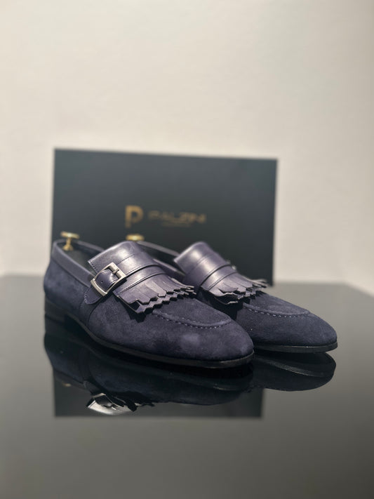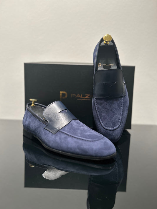 HANDMADE NAVY SUEDE SLIP-ON WITH STRAP & LEATHER DETAILING