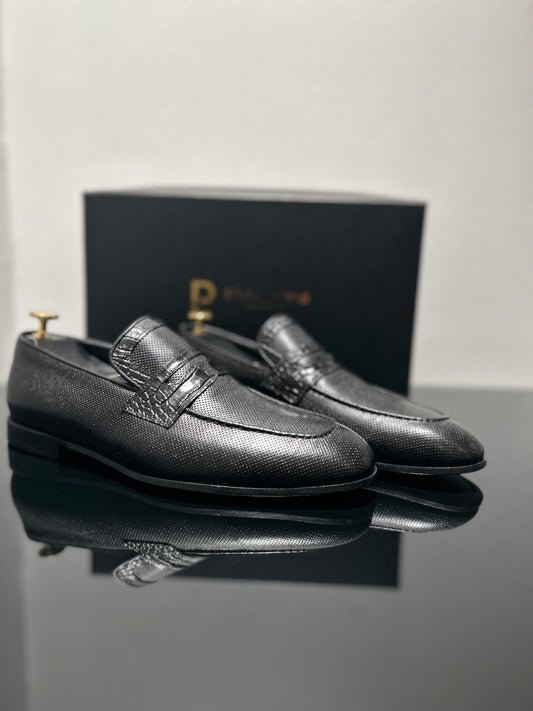 HANDMADE BLACK LEATHER SLIP-ON WITH CROC-PRINT DETAILING