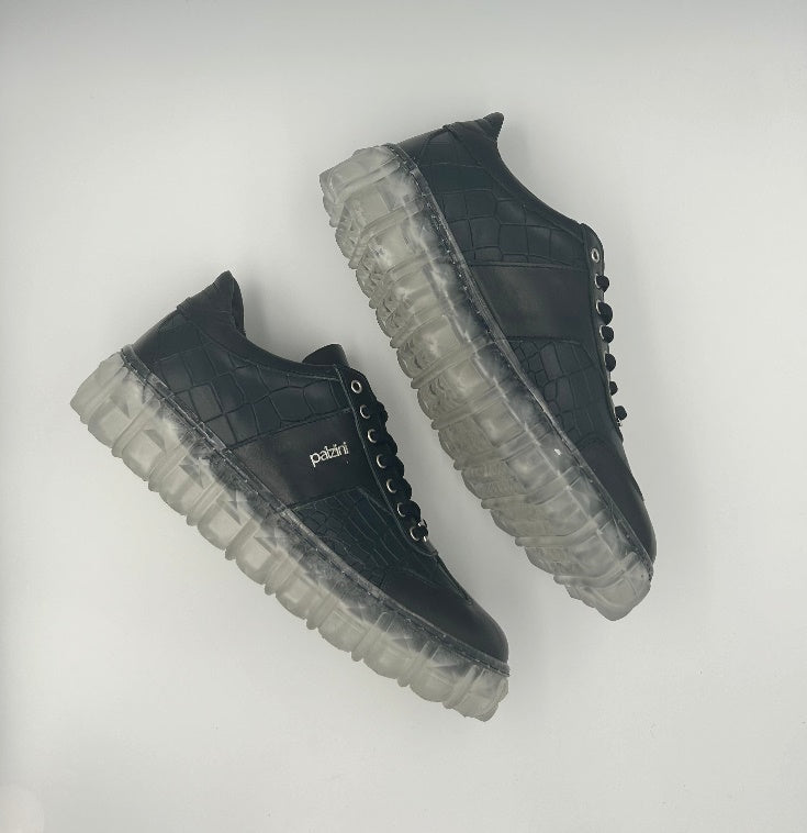 Introducing the Palzini “Frozen Onyx” – a masterful blend of elegance and innovation. This navy sneaker is distinguished by its refined croc-print detailing, offering a touch of sophistication. Set upon a transparent sole, it seamlessly merges contemporary style with luxurious comfort, making it an impeccable choice for those who appreciate both fashion and function.