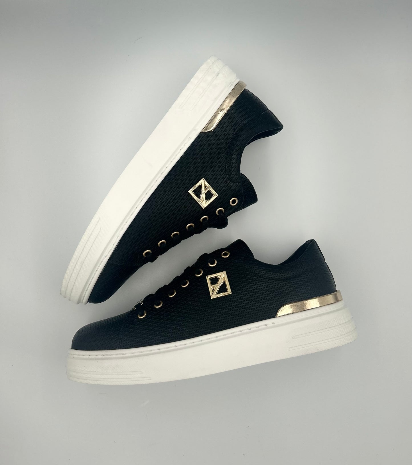 Introducing the "MANHATTAN" Palzini Sneaker, crafted from sleek black perforated leather and adorned with striking gold accessories. Featuring the iconic “PLZ” logo, these sneakers exude urban sophistication and exclusivity. Perfect for the cosmopolitan lifestyle, this piece effortlessly combines bold style with refined luxury. Step into elegance with every stride.