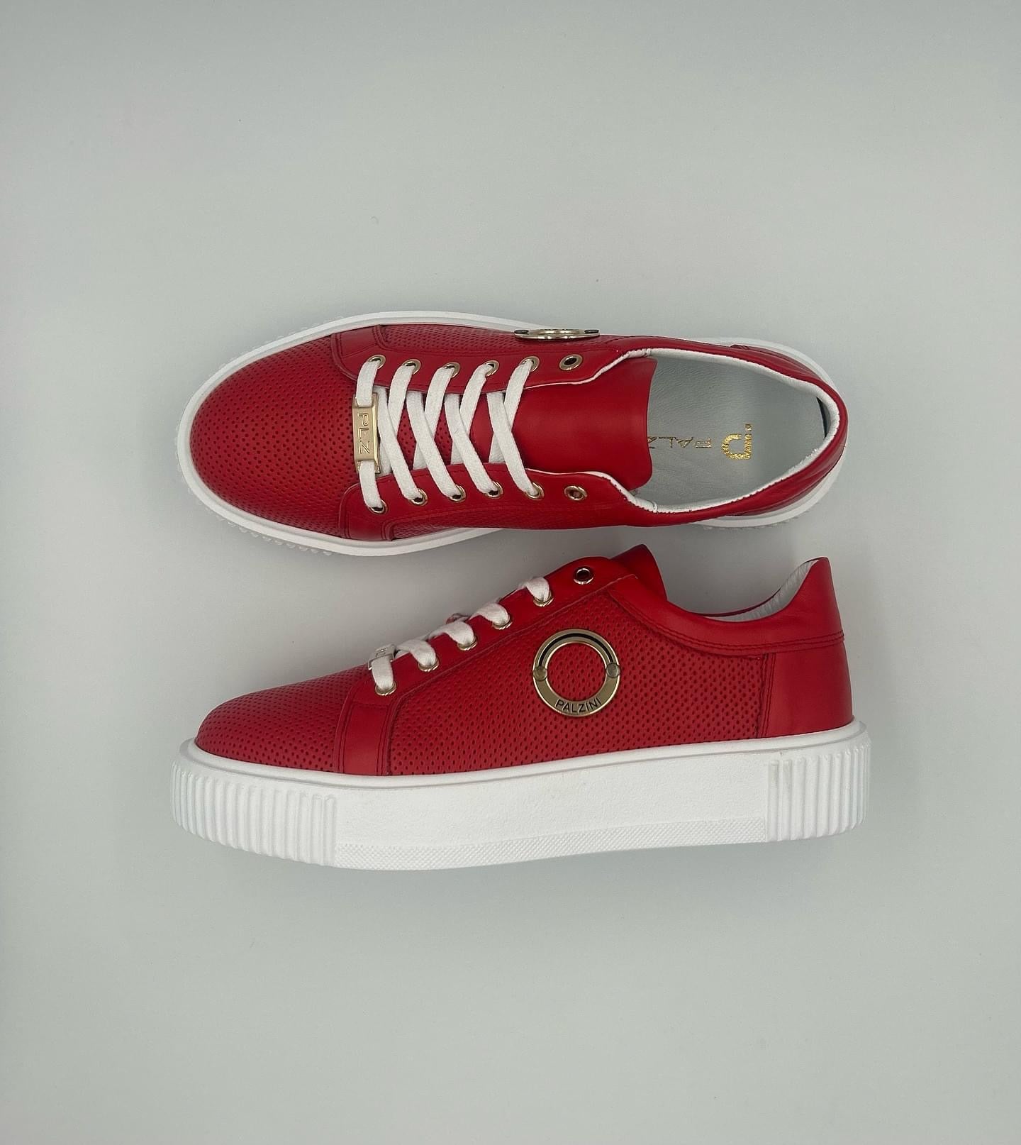 “P-7” LOW-TOP SNEAKERS IN RED LEATHER WITH GOLD RING AND PERFORATED SIDE.